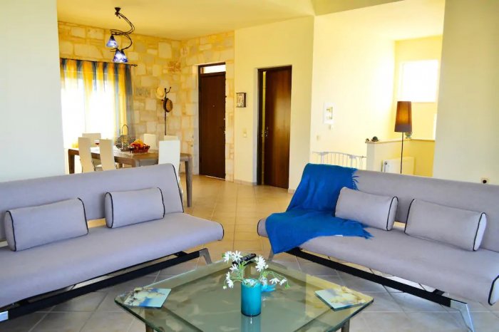 Three villas at the area of Tavronitis in Chania, Crete. All villas consist of 3 good sized bedrooms, 2 bathrooms, balconies and a very comfortable pool. Each house is 135 sqm on a plot of 500 sqm. The villas were built at 2014. Located in an elevated position in the quiet village of Debla, Sense Of Dream Villas have wonderful views across the Bay of Chania to the Rodopos Peninsular and down to the beautiful coastline between Tavronitis and Kolymbari. All of the luxury villas have private gardens with stone BBQ's and seating areas in lush, fertile gardens. Our fully equipped and serviced villas are suitable for all-year-round use with air-conditioning in all bedrooms and living areas, central heating radiators in all rooms and a romantic wood-burning open fireplace in the living room. Each stunning and tastefully decorated villa has three bedrooms, two bathrooms and a spacious kitchen and dining area where you can enjoy tasty meals made with the local fresh produce. The traditional village of Tavronitis is less than one kilometre away and has a variety of small shops selling everything you would need for your holiday, as well as a taverna, kafenion and grill-house.